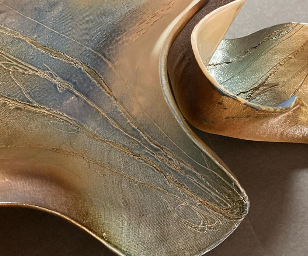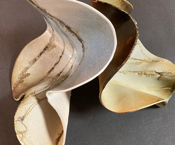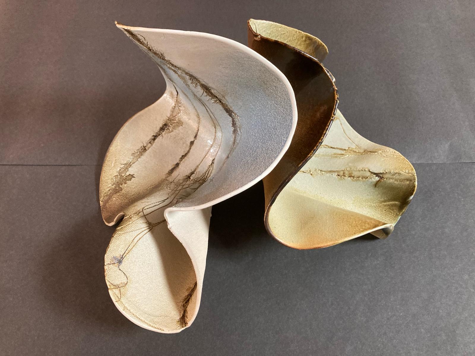 I have used fine white stoneware and paper clay for my work in recent years these are a stark contrast to the previous sculptural forms which were made in brick clay; I have produced textures that suggest the patterns made by water running over sandy beaches. The flowing shapes are produced by hanging clay over hump moulds made from parts of the human body, using gravity to pull the clay naturally into folds giving an untouched surface within the forms.